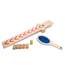 - Originalul joc marca BS Toys consta intr-o placa lansatoare din lemn care se fixeaza peste o baza semicirculara, sase figurine ninja din pluta si o racheta din lemn, asemanatoare unui minciog pentru prins figurinele.