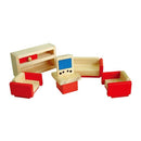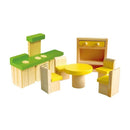 - Casuta din lemn pe doua niveluri are patru camere (dormitor, baie, living, si bucatarie cu sufragerie) dotate cu 24 de piese de mobilier bine lucrate si care se potrivesc perfect in camere. Pe langa acestea mai include doua papusi reprezentand un bunic si o bunica.