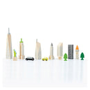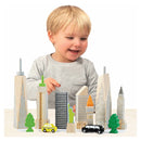 - Setul include 19 piese din lemn: cladiri de diferite forme care lumineaza in intuneric, masini si copaci.