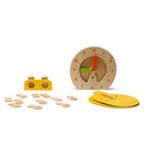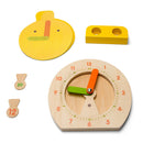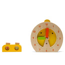 - Acest set contine: un ceas analogic din lemn, un ceas digital din lemn, 8 cadrane din carton si 24 de jetoane din lemn cu ore si minute.