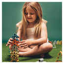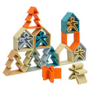 - Camping Friends, nordic colors, contine 18 piese colorate in culori inspirate din natura (tonuri naturale de albastru, gri, kaki, bej, maroniu, caramiziu): 6 omuleti, 6 casute potrivite si 6 brazi.