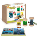 - Setul contine: 8 tuburi cilindrice semi-transparente din acril (in culorile albastru, rosu, galben, verde) cu capetele din lemn, de trei marimi diferite si 5 carduri din carton cu imagini fata-verso.