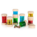 - Cauta, aduna si depoziteaza diferite materiale naturale si obiecte senzoriale in aceste frumoase tuburi cilindrice din acril, in culori primare, pastratoare de comori! Misca tuburile in care ti-ai depozitat maruntisurile, jucariile mici si diferite obiecte interesante si asculta sunetele produse!