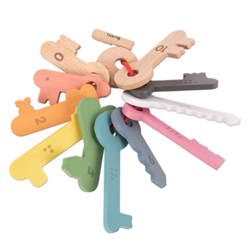 O multime de activitati educative si distractive pot fi realizate cu ajutorul acestui set de chei din lemn masiv in culorile curcubeului, de la Tickit.