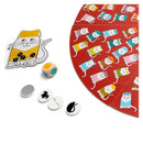 - Cum se joaca: 1. Pune impreuna toate piesele tablei de joc, in mijlocul mesei, pentru a forma un disc. Aseaza nasturii in gaura din centrul tablei de joc. Ofera fiecarui jucator o pisica colorata, mare. 2. Jucatorul care scoate cel mai lung meiunat, incepe jocul. El arunca zarurile si jetoanele. Se pot arunca impreuna, sau unul cate unul. 3. Priveste jetoanele si zarurile pentru a afla ce pisica trebuie sa cauti. Jetoanele pot fi: cu ochii deschisi sau inchisi; model cu buline sau cu dungi; modelul pe palarie sau pe haina; coada ridicata sau coborata. 4. Combina toate caracteristicile zarului si jetoanelor aruncate si fii primul care gaseste pisica potrivita! Tori jucatorii vor cauta in acelasi timp. Esti primul jucator care a gasit pisica potrivita? Alege un nasture si plaseaza-l pe cartonul cu pisica ta mare. Primul jucator care-si completeaza pisica cu 7 nasturi, castiga jocul!