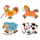 - Setul contine patru sabloane din lemn in forma de animale de ferma (cocos, cal, vaca, oaie), 4 sireturi colorate si parti ale corpului detasabile (picioare, cozi, capete).