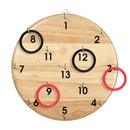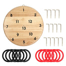 - Jocul contine: un panou rotund din lemn masiv (30 x 2 cm), 13 carlige, 6 inele rosii, 6 inele negre.