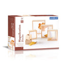 - Setul cuprinde sase patrate de stivuit de marimi diferite cu rame din lemn de esenta tare, care incadreaza ferestre acrilice lenticulare cu efect de amplificare a imaginii.