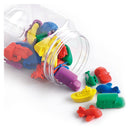 - Setul cuprinde: 36 de mijloace de transport in sase modele si culori diferite, realizarte din plastic moale, un borcan cu capac si maner si o penseta din plastic.