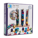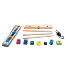 - Setul contine: o baza din lemn, trei bete, 42 de blocuri din lemn de diferite forme si culori, imprimate cu modele, 12 carduri cu provocari si un snur pentru insirat.