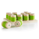 - Cilindrii au partea centrala invelita in cauciuc moale, placut la atingere, pentru a oferi o experienta senzoriala tactila si a fi apucati cu usurinta de catre mainile mici.