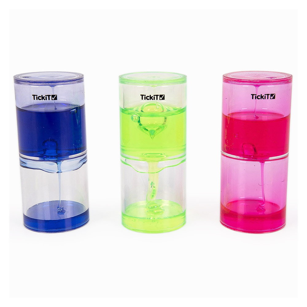 Clepsidra jumbo cu nisip colorat de la TickiT are un design modern care include un bulb elegant din sticla protejat prin incapsulare intr-un cilindru de plastic transparent gros, rezistent la spargere.
